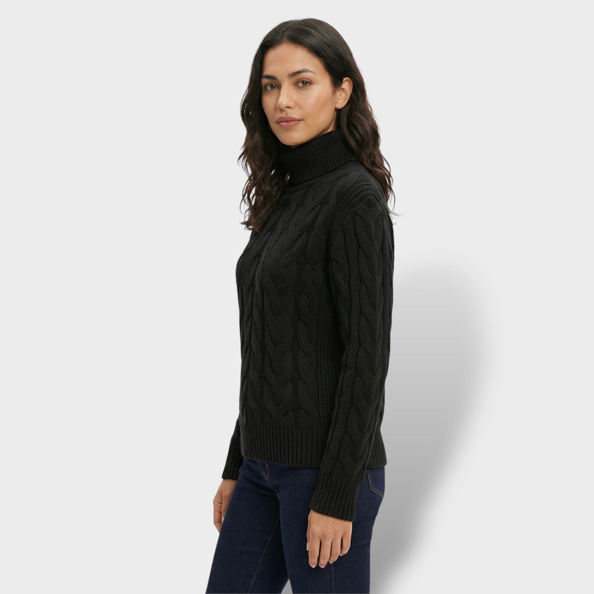 Cuello alto envolvente que aporta calidez y un acabado más refinado.