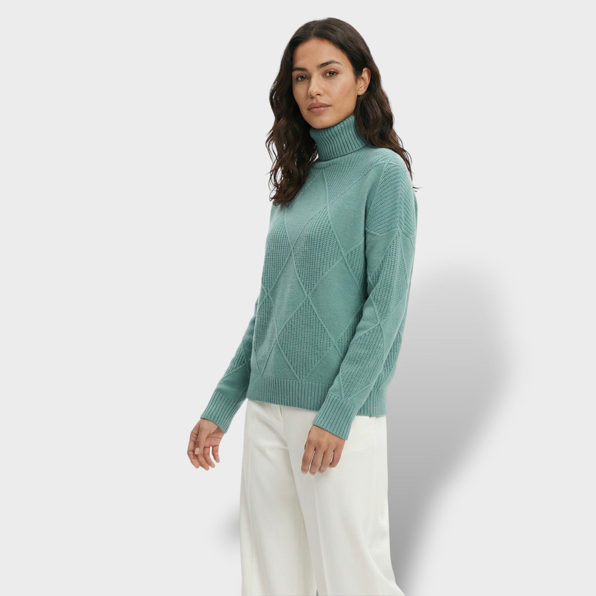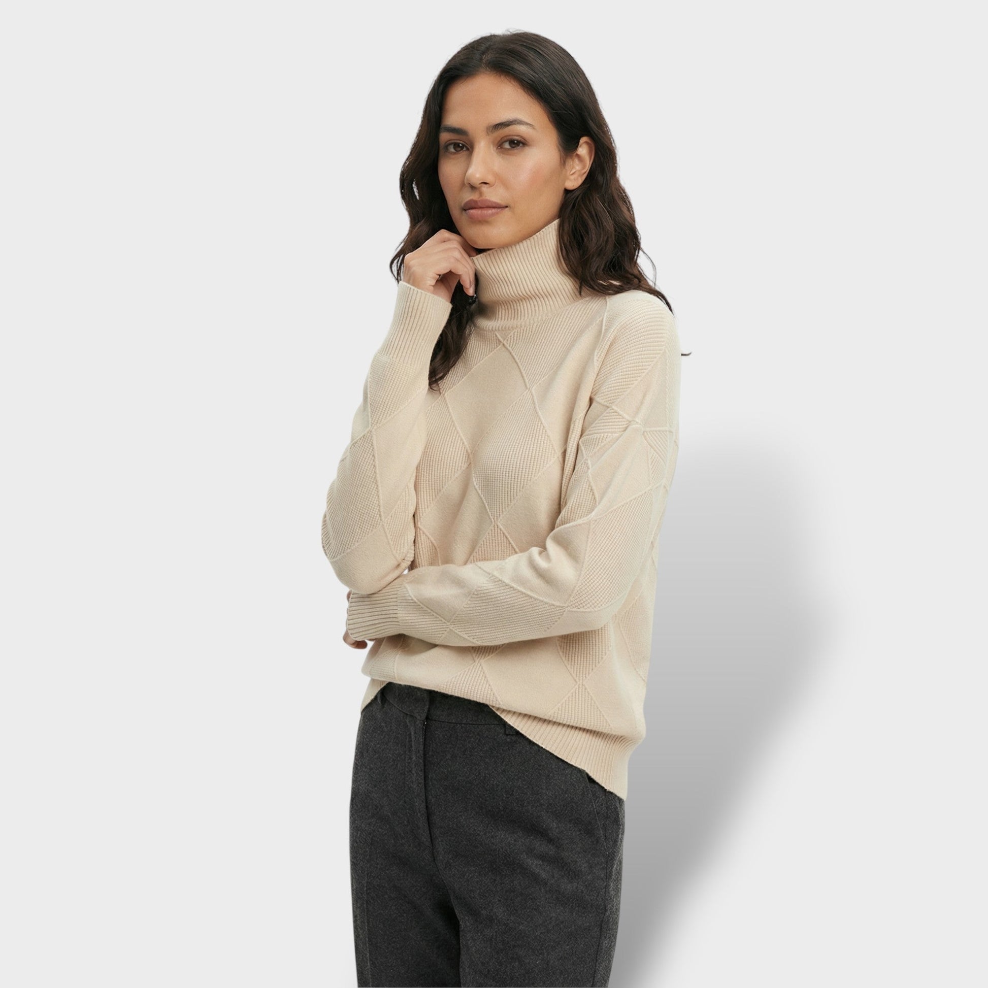 Este jersey de cuello alto aporta una presencia elegante y actual gracias a su punto con rombos, que añade textura y un acabado cuidado. El color liso ilumina el look y facilita combinaciones limpias, mientras el corte holgado cae con naturalidad para una comodidad diaria sin perder estilo. Ideal para llevarlo como protagonista o en capas bajo chaquetas y abrigos.