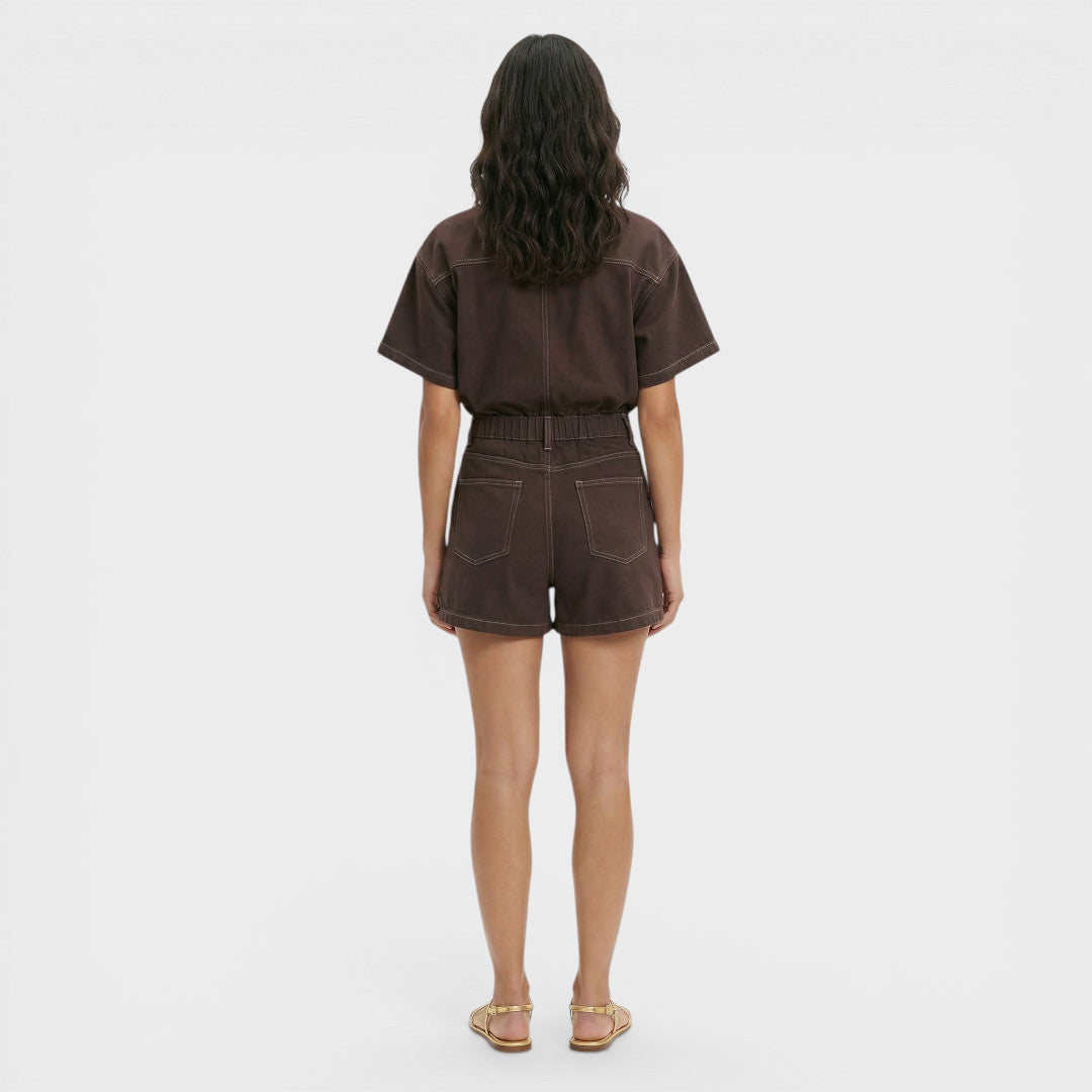 Cintura alta con corte entallado que define la silueta y equilibra la proporción del mono corto.