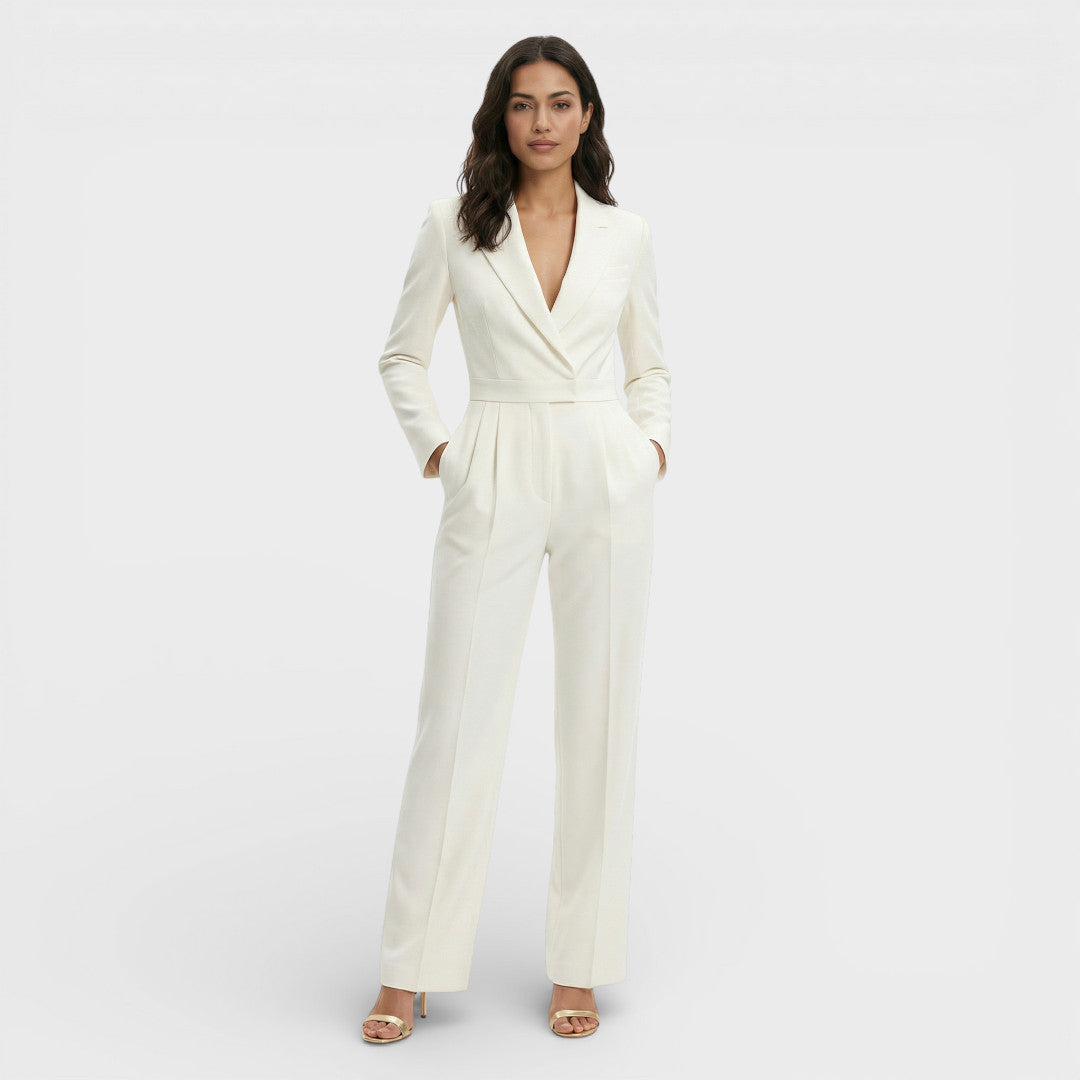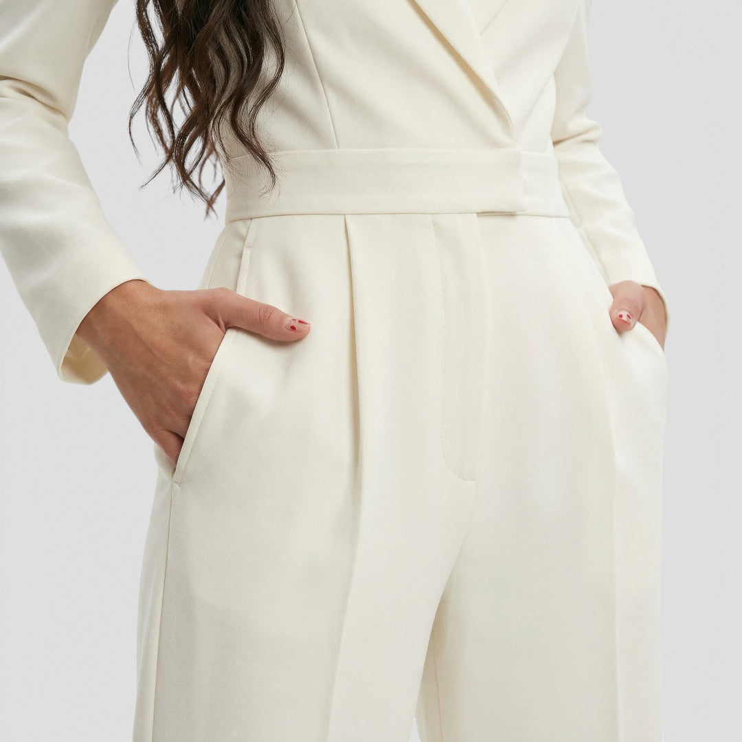 Este mono de manga larga combina una silueta sastre con un diseño poderoso y muy favorecedor. El escote en pico y el cuerpo tipo blazer realzan la figura con un aire sofisticado, mientras el pantalón de pierna ancha aporta estructura y movimiento para un look pulido y actual.