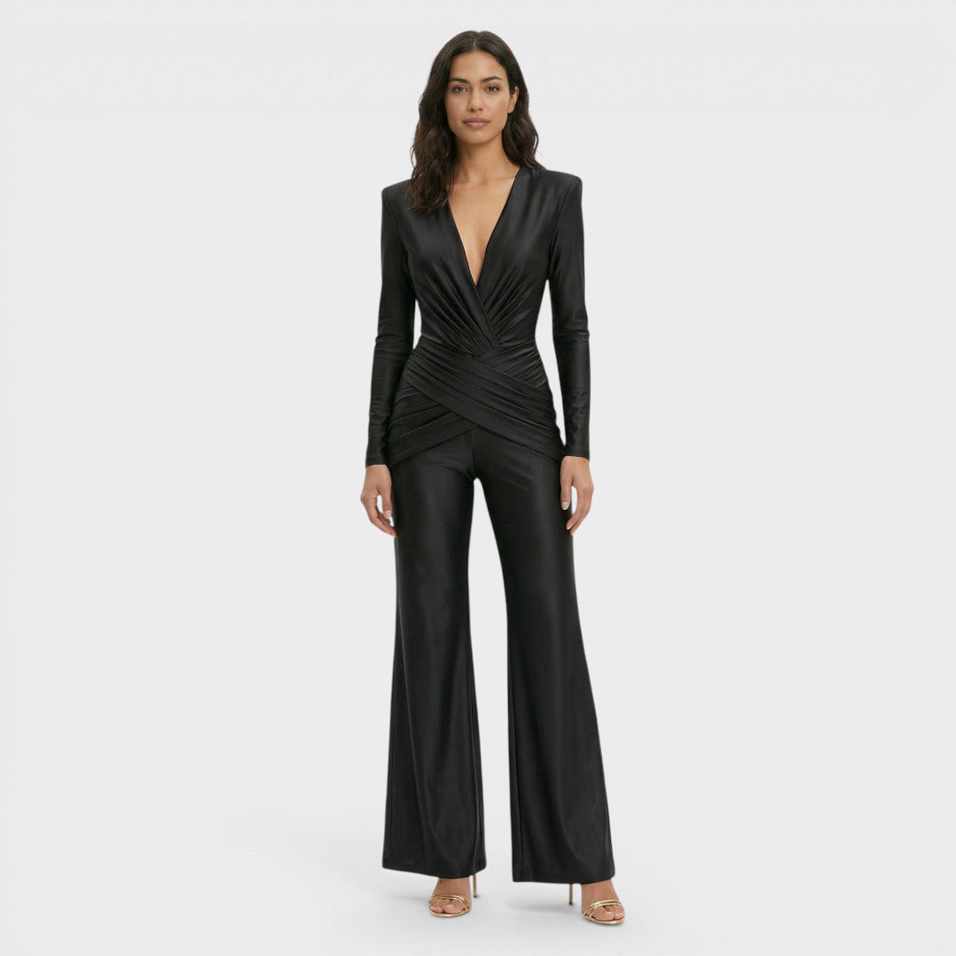 Un mono largo entallado con escote en pico profundo, fruncido cruzado en el cuerpo y manga larga, pensado para una silueta marcada y muy elegante. La pierna acampanada aporta equilibrio y movimiento, creando un look potente para planes de noche o eventos.