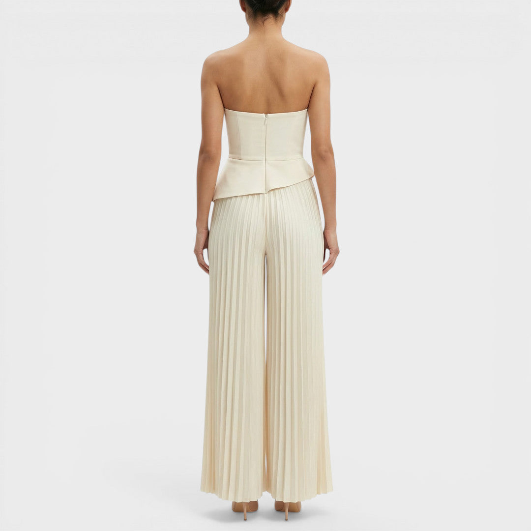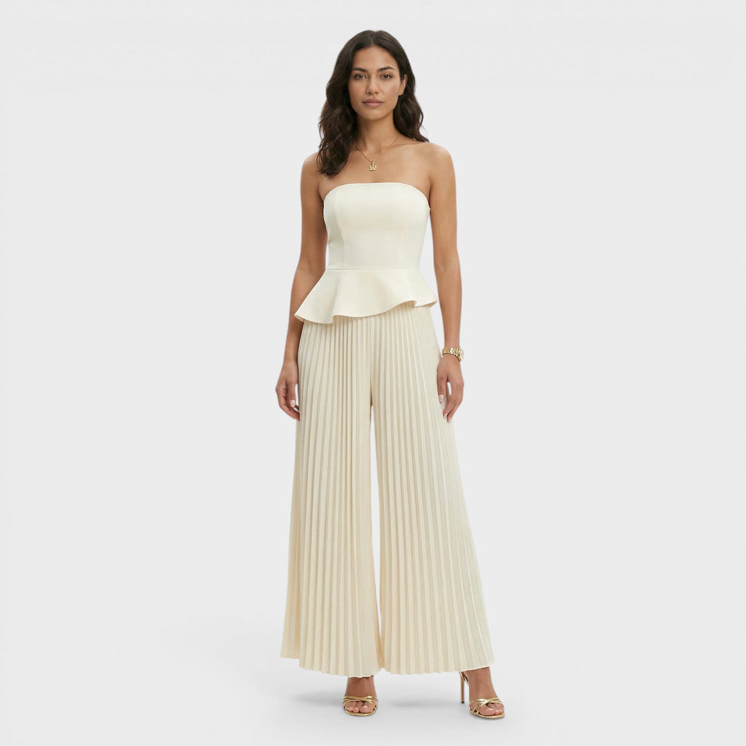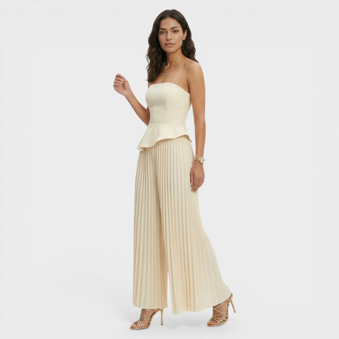 Un mono largo con escote bandeau y pantalón plisado de pierna ancha, pensado para una silueta estilizada y muy elegante. La cintura alta define la figura con sutileza y el movimiento del plisado aporta un acabado sofisticado para eventos o planes especiales.