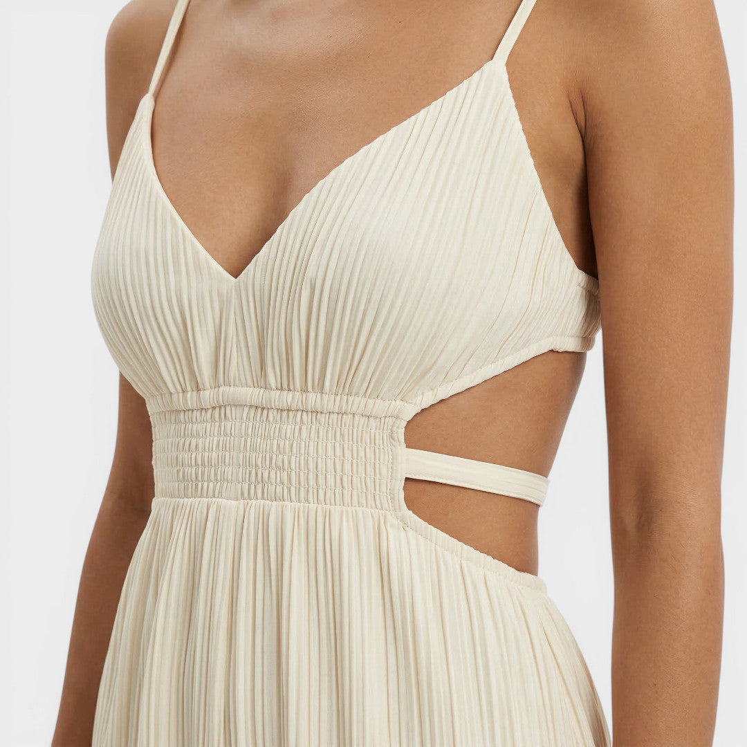 Un mono sin mangas de tirantes finos con cintura fruncida y pierna ancha, pensado para una silueta estilizada y muy favorecedora. El detalle de espalda abierta y cortes laterales aporta un toque especial manteniendo un acabado elegante.