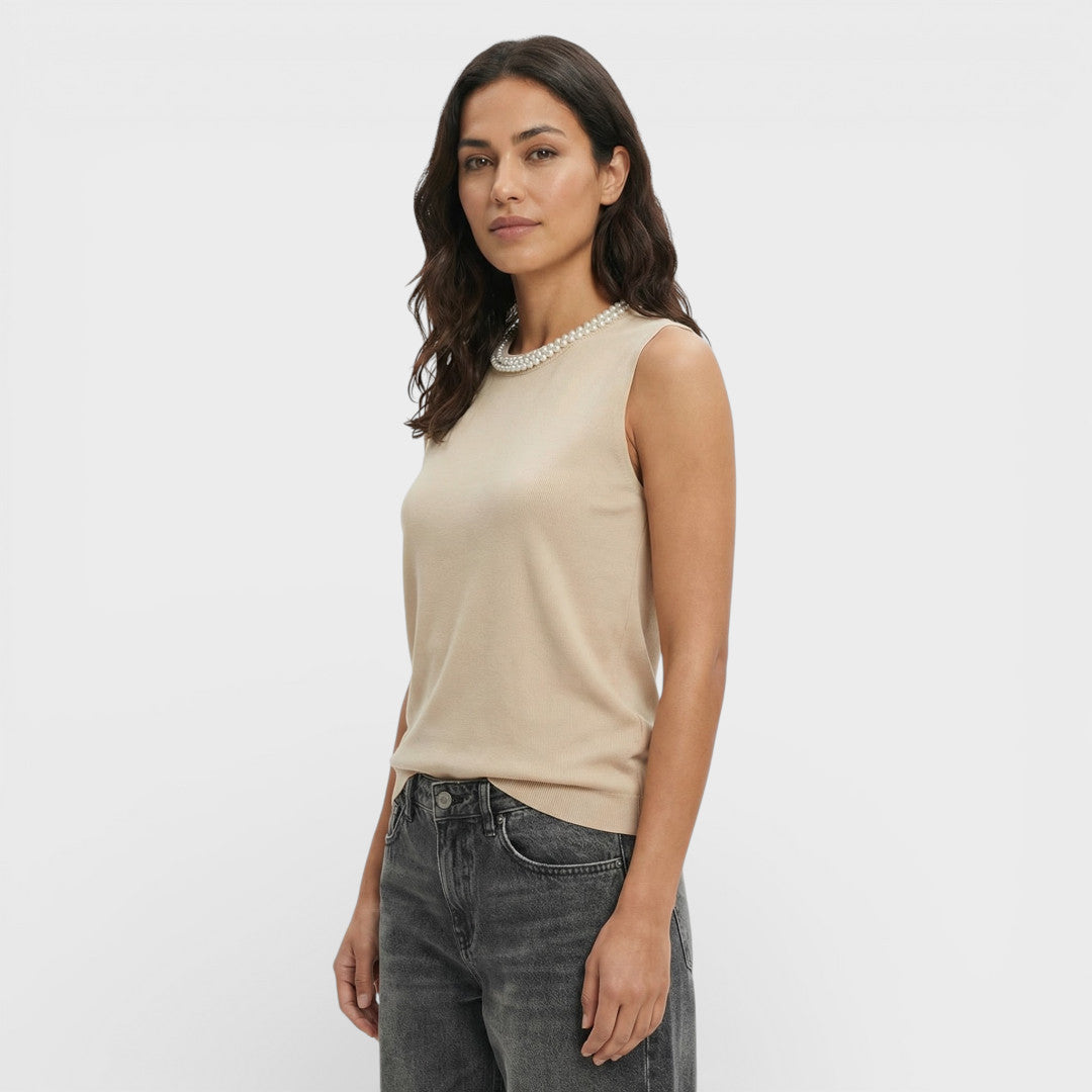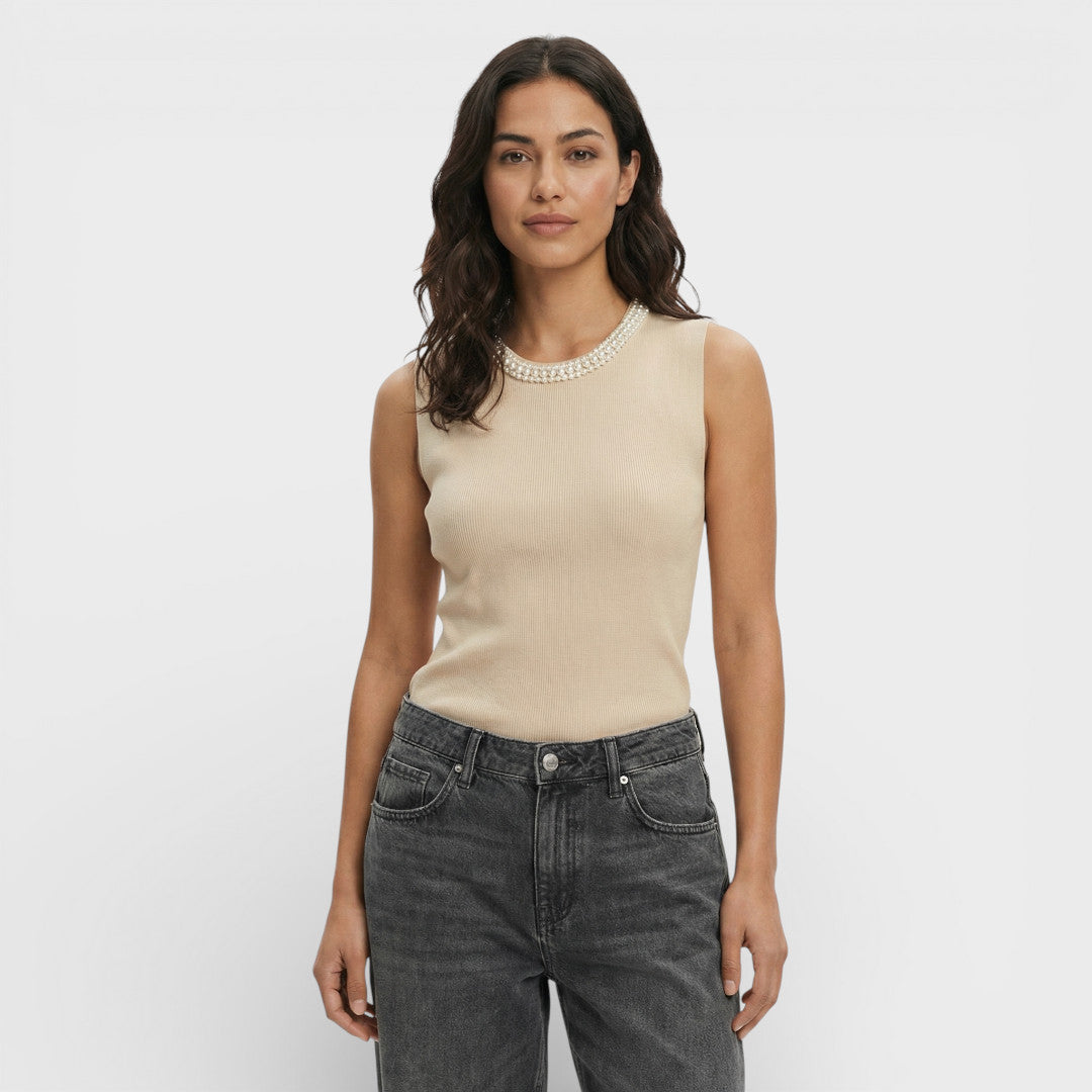 Un top sin mangas de punto con detalle de cuentas en el cuello que aporta luz y un acabado más pulido esta temporada. Perfecto para llevar solo o en capas, con vaqueros, pantalón fluido o falda midi.